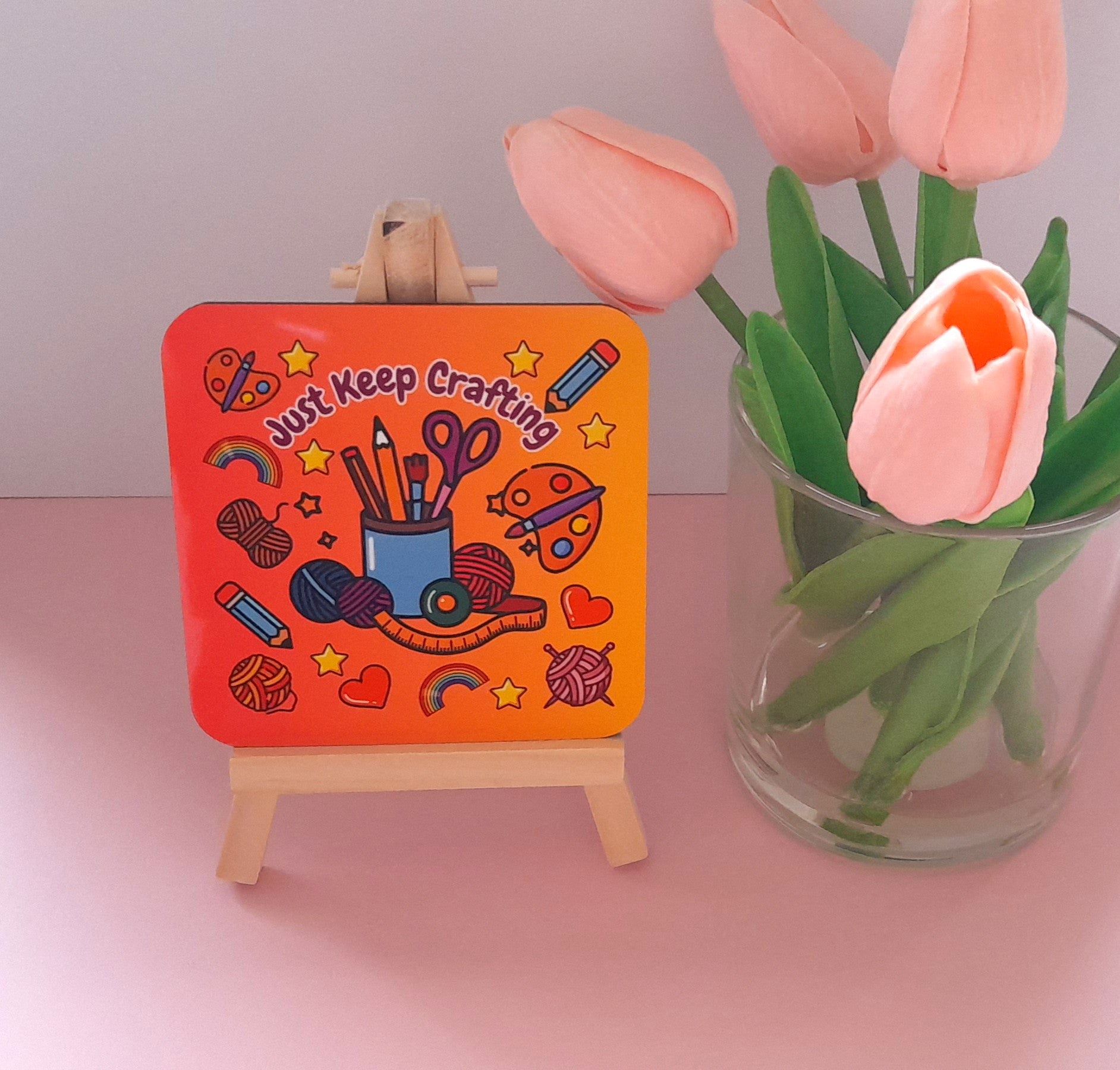 Just Keep Crafting Pink Ombre | Cute Drinks Coaster — Single Coaster | Colourful Design |Cork Backing | Drinkware | Desk Accessory| Cosy Vibes