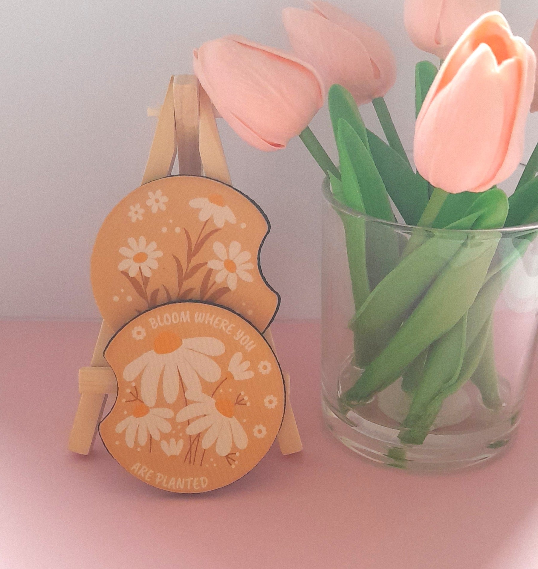 Set of 2 Premium Car Coasters – Cute Absorbent Drink Holders for Car Interior | Inspirational & Motivational Gift | Bloom Where You Are Planted