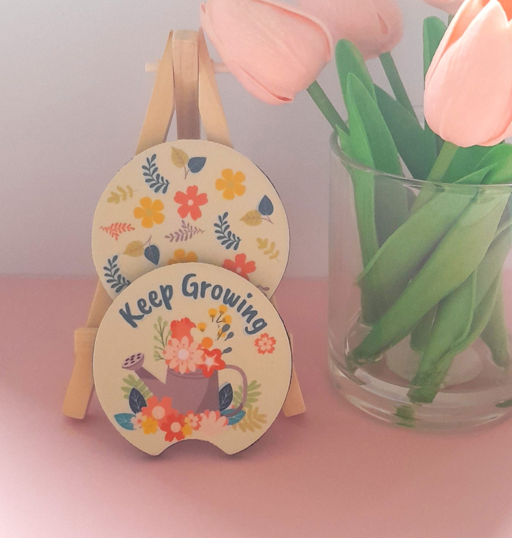 Set of 2 Premium Car Coasters – Cute Absorbent Drink Holders for Car Interior | Inspirational & Motivational Gift | Keep Growing